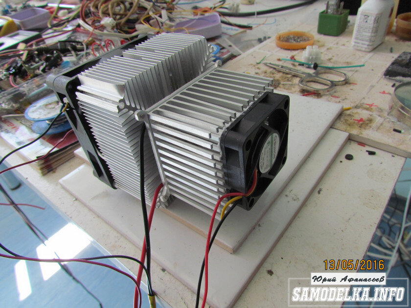 Сегодня мы расскажем, как сделать 12 вольтовый кондиционер своими руками. Привет всем! Сегодня я хочу рассказать как из двух радиаторов от настольного компьютера, двух кулеров и элемента Пельтье сделать 12 вольтовый кондиционер, мощность этого кондиционера 30 ватт но размеры его 5 на 5 см …если его установить в форточку окна\ дело в том что в одну сторону кулер гонит теплый воздух чтобы в помещении был холодный и они не перемешивались..\ между оргстеклом и поставить 5 таких элементов это будет уже 150 ватт. Элемент Пельтье — это термоэлектрический преобразователь, принцип действия которого базируется на эффекте Пельтье — возникновении разности температур при протекании электрического тока. На радиатор где больше кулер я приклеил элемент на теплопроводный клей. на другую сторону я тоже приклеил радиатор с меньшим кулером включаем в блок питания и уже через минуту из маленького кулера пошел прохладный воздух 19 градусов. Кулеры должны выдувать каждый в другую сторону от элемента. Если ег