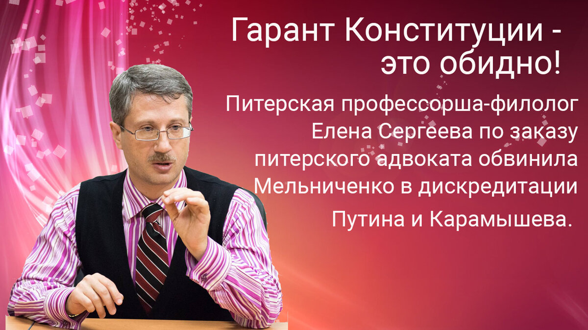Питерская профессорша-филолог Елена Сергеева по заказу питерского адвоката обвинила Романа Мельниченко в дискредитации Путина и Карамышева. Заключение специалиста № 100/26 Исследуется текст "Адвокат, вешающий на стену своего офиса "гарант", даже если это адвокат из "бывших"". "2. Слово "гарант" в соответствии с правилами современного русского языка должно быть употреблено в форме с окончанием а (гаранта), так как это одушевлённое существительное. .... В случае намеренного написания данной формы это реализация стратегии дискредитации личности Путина В.В." "Ирония является тактикой реализации общей стратегии дискредитации личности К.А. Карамышева"