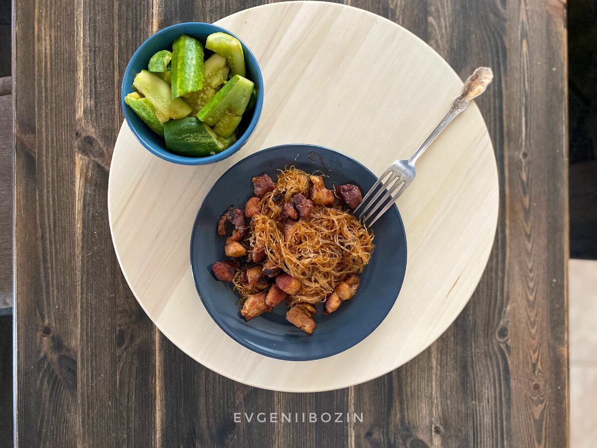 И вот я уже потихоньку начал экспериментировать. Есть на вооружении пара салатиков, вторые блюда с рисом, скоро буду осваивать Фо–бо (этот суп так вообще сейчас на первых местах в моих чартах). Но в первую очередь я научился делать фунчозу со свининой по классическому китайскому рецепту.