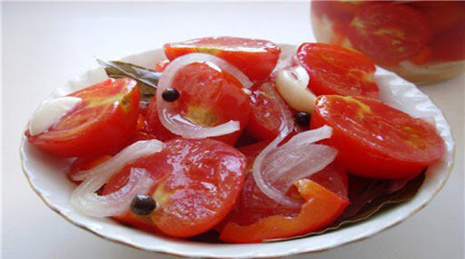 По этому рецепту всегда консервировала моя любимая бабушка. Этим рецептиком всегда пользуюсь теперь и я.Мои помидоры обожает вся моя семья.Съедается абсолютно всё,а рассол просто бомба! Сейчас на просторах интернета множество подобных рецептур,но мой рецепт я вам даю из старенькой затертой бабушкиной записной книжечки! Итак,на дно литровой банки положить половину большой луковицы,нарезанной колечками и 3зубка чеснока.Красивые,но не переспевшие помидоры разрезаем пополам и кладем шаром(слоями) на лук (срезами кверху).Затем притрушиваем черным молотым перцем и кладем веточки петрушки.Следующий слой -помидоры.Всё это повторяем несколько раз.На последний слой кладем кольца второй половины лука. Кипящим маринадом заливаем банки и стерилизуем 15 минут.Закатать. Маринад: 3 литра воды,3 ст.л. соли, 5 ст.л. сахара, 1 ст. уксуса, 5 зубочков чеснока, несколько горошин черного перца.