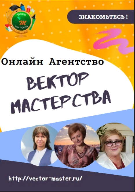 Уважаемые коллеги, друзья, давайте познакомимся ЕЩЕ РАЗ! Многие преподаватели профессионального образования Чувашии с сотрудниками Онлайн Агентства" Вектор Мастерства" знакомы непонаслышке. За 5 лет сотрудничества было проведено свыше 50 мероприятий в формате онлайн - это конференции для студентов и преподавателей, самые разнообразные конкурсы, марафоны, фестивали, мастер-классы, обучающие семинары, курсы и так далее! Юлия Викторовна Иванова (Санкт-Петербург) - 27 лет педагогического стажа, учитель по информатике, профессиональный репетитор, преподаватель и технический специалист Агентства, автор различных дистанционных обучающих курсов. Грибанова Ольга Владимировна (Санкт -Петербург) -25 лет педагогического стажа, преподаватель-филолог, руководитель Онлайн Агентства "Вектор Мастерства", координатор специальных проектов Интернационального Союза писателей, автор обучающих онлайн-курсов. Рудакова Людмила Павловна (Чебоксары) - 40 лет педагогического стажа, преподаватель основ пр
