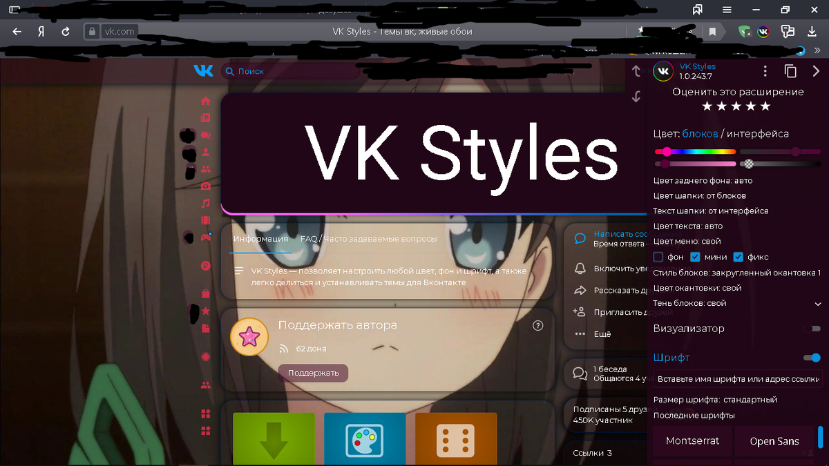 VK Styles это расширение для такой площадки как ВК. Оно подойдет для браузеров: Гугл хром, яндекс браузер, опера-опера джиикс и фаерфокс. Если вам надоело видеть этот скучный никому не интересный внешний вид то это расширение для тебя! В этом расширении ты можешь: Менять фон, зафиксировать левое меню при скроле ленты, сделать меню меньше как у меня, поменять цвета хоть на своем коте, можно сделать фон для левого меню и не только, присутствует визуализатор который появляется при прослушивании музыки и его можно настроить. Если вы не хотите сидеть долго в настройках то можете зайти в группу и выбрать там тему которая будет вам по душе ( http://catcut.net/rjvN ). Больше об этом расширении я не могу рассказать так как больше нету ничего ведь это расширение сделано порадовать глаз а не похвастаться большим функционалом. Остается оставить ссылку на это расширение ( http://catcut.net/2jvN ).