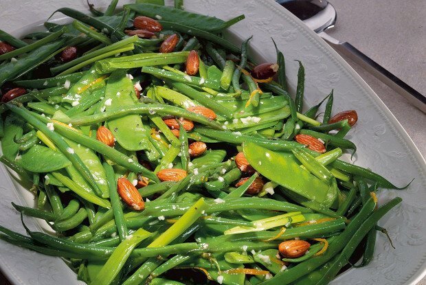 4. На мелкой терке натереть цедру апельсина, выжать из бритого апельсина немного сока — две-три ложки буквально. Смешать цедру, апельсиновый сок, оливковое и миндальное масло с фасолью, горошком, нарубленным зеленым луком и миндалем, посолить и поперчить. Можно еще сдобрить соевым соусом. Как еще одним представителем рода бобов.