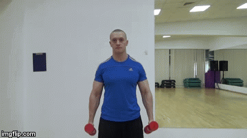 Упражнения для рук с гантелями для мужчин в домашних условиях.Как я уже сказал выше, руки- это бицепс, трицепс и предплечье. Они могут как сочетаться в одной тренировке, так и тренироваться отдельно, с более крупными мышечным группами, но об этом чуть позже. Начнем у упражнений на бицепс с гантелями для мужчин. Подъем гантелей на бицепс стоя. Это одно из самых распространенных и эффективных упражнений на бицепс с гантелями (при этом одно из самых эффективных). Очень часто именно с него начинается тренировка рук. Я не буду подробно расписывать технику, ибо она довольно проста и достаточно наглядно показана на изображении. Просто повторяйте за мной, соблюдая эти движения. В начале своего тренинга, я рекомендую заниматься у зеркала, чтобы вы видели то, что делаете. Часто новички только думают о том, что все делают правильно, а по факту: локоть гуляет, амплитуда неполная, движения рывковые и за счет спины. В общем, следим за техникой. Можно выполнять как двумя руками сразу, так и каждой