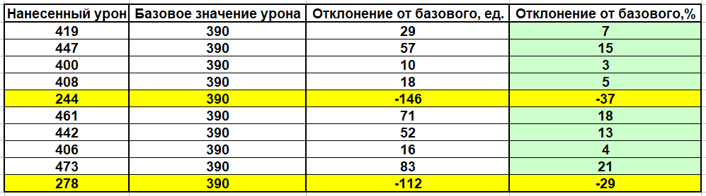 Вдохновленный комментариями к некоторым предыдущим статьям я решил на примере нескольких боев показать, как всё это выглядит в задокументированных мною боях. Специально базу для исследования я не собирал, прибег к уже записанным и размещенным здесь и на Youtube. Начнем. Бой №1. Т54Е1. Линия Зигфрида. Бой с десятками. Вот, что мы настреляли: Желтым выделены выстрелы, унесшие жизнь и нервы неприятеля. В статистику не входят выстрелы без урона, промахи и попадания в препятствия. Также не рассматривается полученный урон. На протяжении всего боя WG отчаянно выкручивал урон с каждого моего снаряда в плюс, что видно по бледно-зеленой окраске столбца отклонения в процентах. При этом, в желтых строках непонятно, с каким плюсом или минусом проходил урон, так как его значение лежит за пределами отклонения -25% . То есть, даже если бы прошла минималка, то соперник был бы все равно добит. В плюс больше 25% также не зафиксировано. Бой №2. Т54Е1. Утес. Взят "Основной калибр" Какую картину мы видим: З