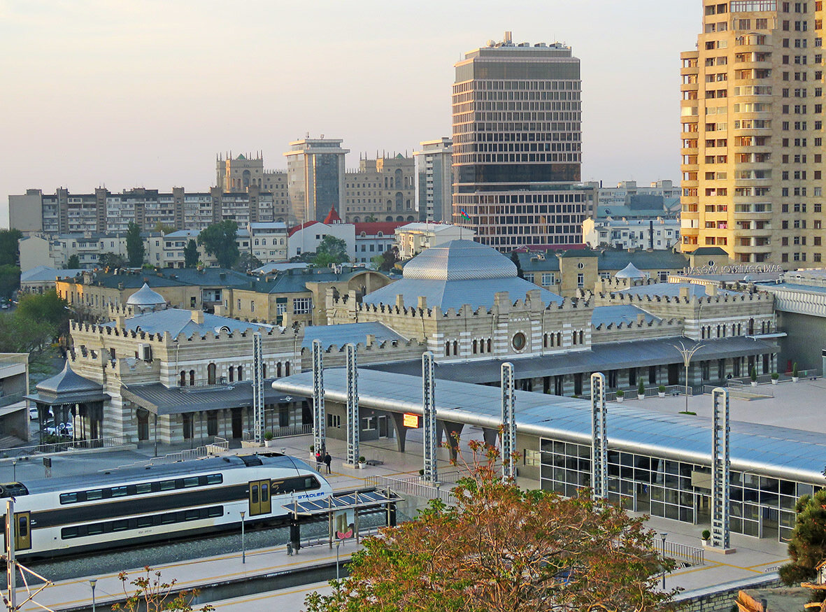 Кадр выше показателен тем, что на нём прекрасно видны все "горизонты" бакинского центра - Дом Правительства у моря и чёрная стеклянная высотка аккурат между улицами Хагани (продолжающей Молоканку) и Низами. Ну а на переднем плане - станция Баку-Пассажирская, в которой на самом деле не один, а целых 3 вокзала: