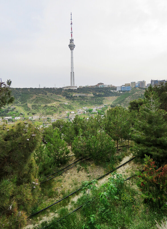 На другом отроге Бакинского холма торчит телебашня, строившаяся в 1979-88 годах. Дальше она рисковала повторить судьбу телебашни в Екатеринбурге, но уже в 1993 году в опустошённой стране на грани гражданской войны стройка возобновилась. Открытие башни в 1996-м, как в Армении запуск АЭС, подвели черту под смутой. Среди бетонных советских телебашен Бакинская была самой маленькой (310м), а среди всех нетиповых проектов - второй с конца после Тбилисской. На башне есть вращающийся ресторан, и судя по чужим фотографиям, во всём Баку это лучшая смотровая площадка.