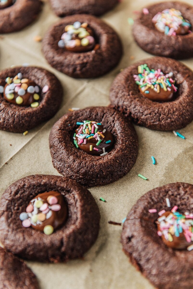 • Посыпки Dr. Oetker - для декора Способ приготовления: ① В чаше блендера смешиваем все ингредиенты и замешиваем тесто. ② Заворачиваем его в пищевую пленку и убираем в холодильник на 30 минут. ③ Из теста формируем шарики (по размеру - чуть больше грецкого ореха). ④ С помощью большого пальца руки делаем углубление. ⑤ Выпекаем в заранее разогретой до 180 градусов духовке 8 минут. ⑥ Вынимаем готовое печенье (оно немного растечется и исчезнет углубление), с помощью чайной ложки аккуратно делаем выемку. ⑦ Полностью остужаем печенье.