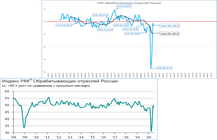 Опережающий индекс PMI, отражающий настроение менеджеров в промышленности, в июле показал значение 48,4 пункта. Сразу две плохих новости: индекс ниже 50 пунктов (граница между ростом и падением) и ниже, чем в прошлом месяце (июньское значение 49,4 пункта). Если попробовать найти позитив, то стоит отметить два момента: 1. После глубокого провала (ниже 35 пунктов) индекс приблизился к отметке 50 пунктов значительно быстрее, чем во время кризиса 2009 года (см. нижний график). 2. Сейчас индекс выходит на уровни прошлого года. Дело в том, что индекс опустился ниже 50 пунктов ещё в июне 2019 года (см. выноски на верхнем графике). Другими словами, причины начала кризиса были вовсе не в коронавирусной пандемии и не в падении цен на нефть. Но выше речь шла об индексе в обрабатывающей промышленности. Главный же позитив в другом. Совокупный индекс, учитывающий кроме обрабатывающей промышленности ещё и сектор услуг, достиг 56,8 пунктов, то есть преодолел заветную планку 50 пунктов и вошёл в