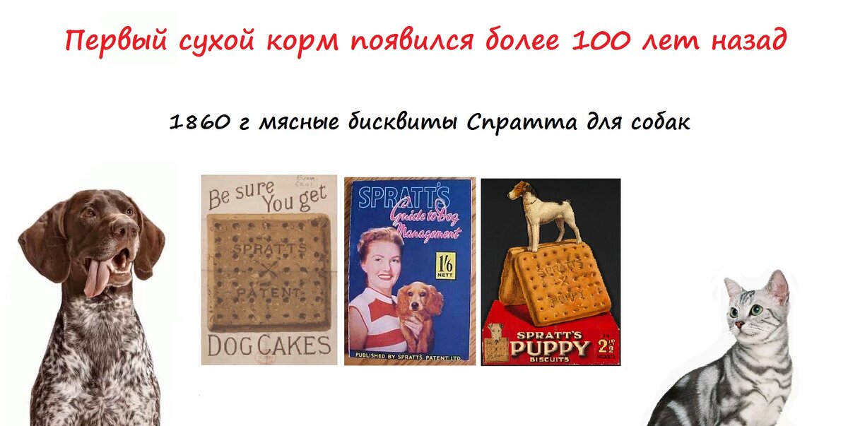 Первый сухой корм появился 1860 х годах позапрошлого столетия. Предприимчивый джентельмен Джеймс Спратт путеществовал из США в Великобританию заметил что в порту и на корабле собаки с удовольствием поедали галетты из сухого пайка матросов. Немногим позже Спратта посетила мысль о производстве промышленных бисквитов для собак, а в 1860 году этот продукт был зарегистрирован под названием «Патентованные мясные бисквиты Спратта для собак». Они представляли собой запеченную смесь из пшеничной муки, мякоти свеклы и овощей, замешанную на телячьей крови. Печенья Спратта рекламировались, как превосходное питание для собак. Хотя многие ветеринарные специалисты оспаривали полезность такого го питания собак. В начале прошлого столетия в 1930 – 40 х годах начинается «эра сухих кормов». На тот момент существовало два типа сухих кормов: гранулы (готовые сухари или сухарная крошка) и шарики (ингредиенты для них нужно было самостоятельно замешивать вручную). Следующая ступень в истории - это
