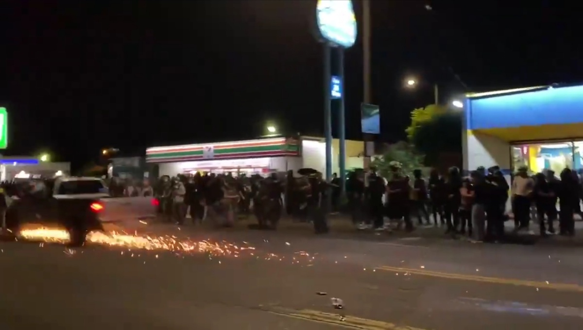 В Портленде где то в США, водителю не понравилось, что протестующие перекрыли улицу, ну а проехать надо же как то, поэтому он сбил рядом припаркованный мотоцикл и пролетел сквозь толпу на большой скорости Впрочем как мы знаем, ничего нового из США, у них там своя атмосфера.
