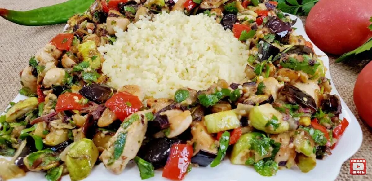 Оригинальным образом обжаренные овощи и ломтики мяса в сочетании с восточным кускусом и лимонной заправкой создают неповторимую феерию вкусов. Приятного аппетита!