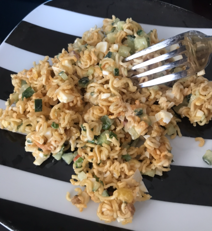 Ингредиенты: 6 пачек лапши быстрого приготовления (одного вкуса) 6-7 варёных яиц зелёный лук (по вкусу) 3-4 свежих огурца майонез (по вкусу) 1/2 стакана холодной воды Способ приготовления: 5. Остаётся хорошо перемешать, и можно подавать. Это очень простой, но очень вкусный салат. Приятного аппетита! Если хотите больше рецептов, переходите ко мне на канал. Всем хорошего настроения!