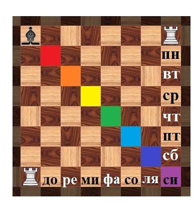 Демонстрируем детям связь шахматной доски и выбранных нами систем отсчёта в музыке, рисовании и делении года. Обращаем их внимание на то, что у нас остались "не заполненными" по 21 клеточке с каждой стороны от цветной диагонали, а первая горизонталь "нот" вообще говоря вмещает полную октаву, а на вертикали "h" понедельник можно сдвинуть вверх на одну клеточку и тогда воскресенье не совпадёт с нотой. Полезно предложить детям старшего возраста поискать свои собственные "расшифровки" шахматной доски, используя предложенный вариант, как "пример на тему"