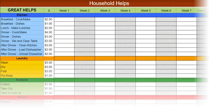 Семейные хлопоты могут наскучить, и никто не делает их со страстью. Используйте этот шаблон, чтобы сделать вещи проще. Возьмите область и не только распределите ответственность, но и дайте вашей семье некоторый стимул закончить каждый из них. Один шаблон может охватывать семь недель домашних заданий.