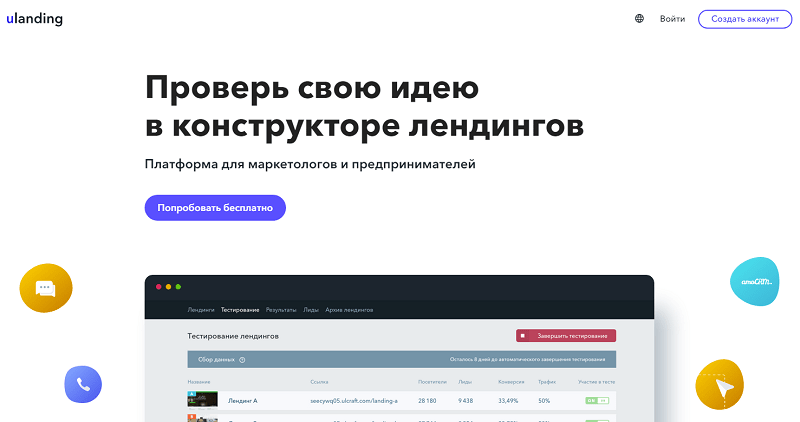 uLanding позволяет создавать качественные посадочные страницы и увеличивать их конверсию с помощью тестирования и детального анализа результатов не только профессиональным маркетологам, но и начинающим интернет-предпринимателям.