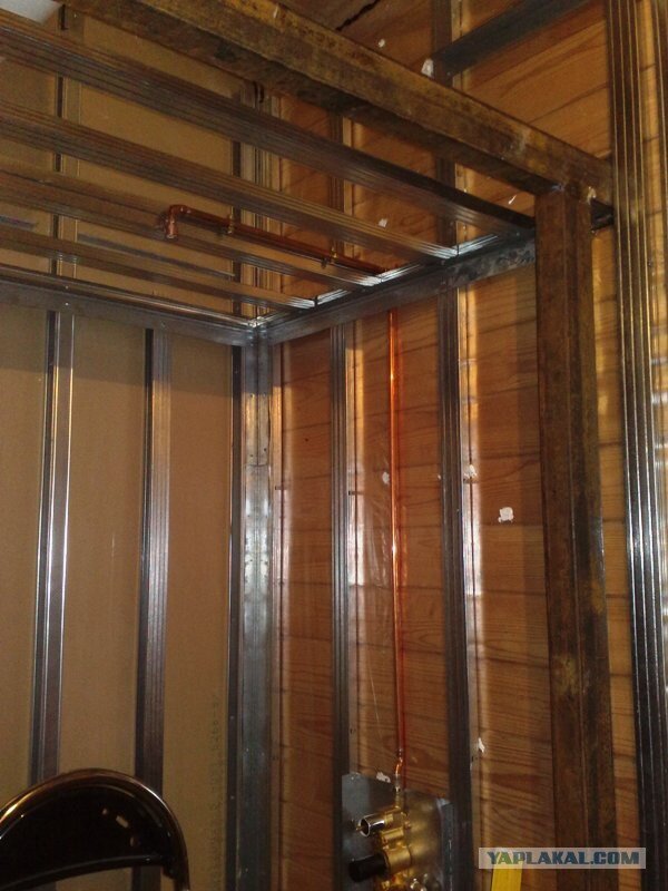 Небольшой отчет о постройке Дом деревянный, поэтому присутствует определенная специфика в обустройстве санузла, а конкретно надо учитывать что стены деревянного дома нестабильны. У меня летом потолок выше чем зимой на 0,5%. Вроде бы немного, но это 1,5 см. И если я на эту стену жестко закреплю материал который не тянется то трещины неизбежны.