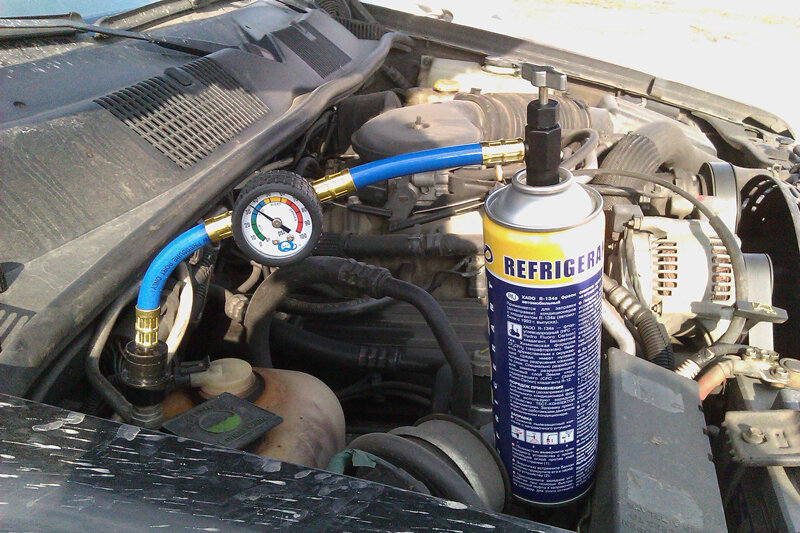 Самостоятельная заправка автокондиционера своими руками. Это возможно, но есть огромный ряд нюансов, которые стоит знать! Самостоятельная заправка автокондиционера даст результат только в том случае, если в системе кондиционирования вашего автомобиля в магистрали отсутствует утечка. Компрессор исправен, в системе достаточное количество масла, испаритель и конденсатор чистые, и все датчики в норме. Микроутечки фреона происходят через уплотнительные кольца соединений трубок, коих в машине достаточно много. Бывает, приходится дозаправлять каждый год, и в принципе это нормально. Для этих случаев вполне подойдет самостоятельно заправка системы кондиционирования автомобиля хладагентом R134. Емкость баллона для самостоятельной заправки маленькая 800 грамм. Его вполне может хватить на два – три раза. Рекомендую не переворачивать при заправке, не надо заливать в систему жидкую фракцию фреона. Просто подсоедините быстросъемное соединение к порту низкого давления, это более толстая трубка. Не