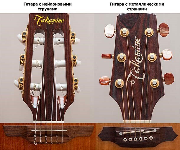 Как отличить акустическую гитару от классической? Взгляните на изображение ниже, и вам все станет понятно. Не будем касаться отличия в размере и форме деки и грифа (все-таки они бывают разные), но обратим внимание на колковую механику и на нижний порожек. Металлические струны крепятся не на самом подструннике, а с помощью специальных пинов «утоплены» вглубь корпуса гитары.