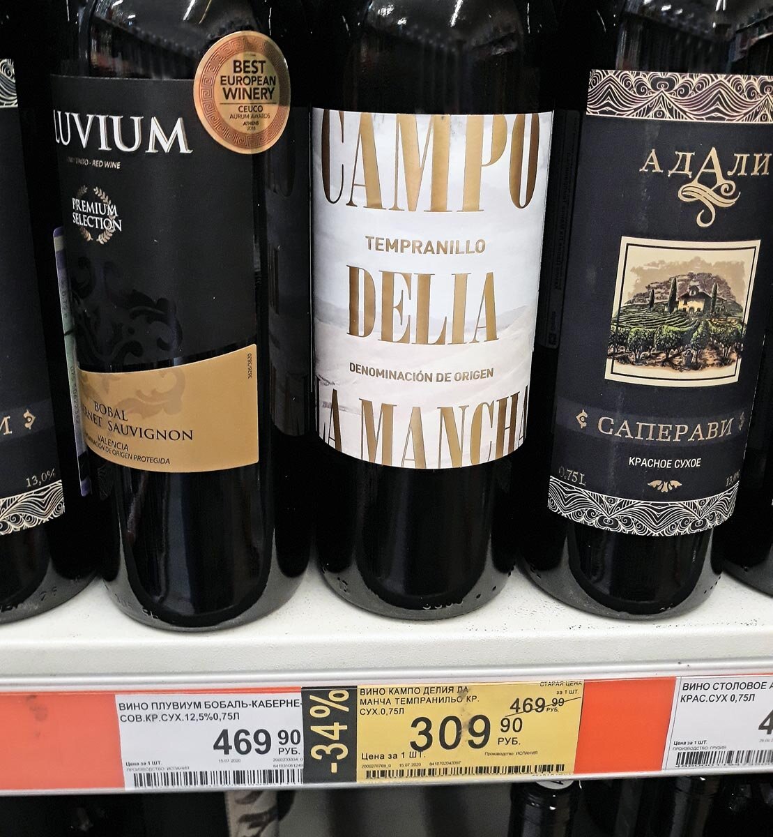 Например, на испанские недорогие вина Campo delia la Mancha, Темпранильо и Айрен, с 6 по 26 августа объявлена акционная цена 309 рублей. Но ценник такой уже с 15 июля.