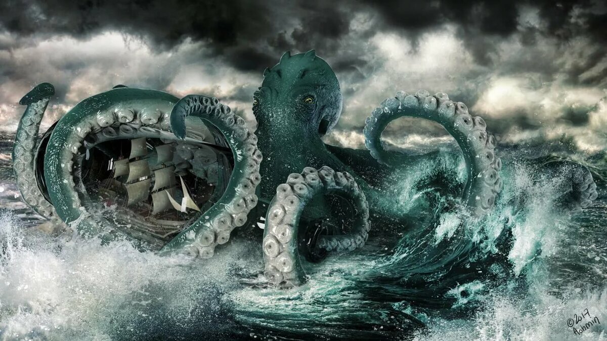 Легенды о гигантских кальмарах, нападающих на проходящие корабли и утягивающие их в пучину, имеют под собой обоснованные факты. Головоногие моллюски имеют в длину около 10-15 метров. Очевидцы утверждают, что на их судно нападал кальмар более 50 метров, а снимки NASA со спутников показывают наличие огромных животных в океане длиной почти 2 км. Так что мифы о кракенах далеко не вымысел. Ученые опровергают саму возможность существования животных таких размеров, его просто разорвало бы на части. Но в архивах хранятся свидетельства многих моряков, видео, фотографии, которые доказывают, что кракены реальны. Одна фотография моллюска с глазным яблоком в 26 см подтверждает сотни историй и мифов. Много кадров можно найти в интернете. Японскому китобою посчастливилось поднять на борт кашалота, погибшего в смертельной схватке в объятиях 50-метрового кальмара, щупальца которого обвились вокруг туши животного. Но кашалот успел нанести глубокие, рваные раны своему противнику.