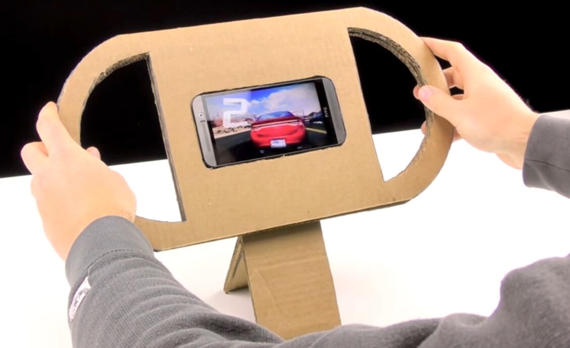 Гениальная самоделка! Особенно, если вы играете в игры на смартфоне или планшете. Сделать такое удобное приспособление довольно просто и быстро. Для еще более удобного держания руля я бы обмотал его обычной изолентой. А сам картон можно еще покрасить краской из баллончика, например в черный цвет. В общем, если вам такой нужен - смотрите видео и повторяйте все как там или улучшайте по вашему вкусу.