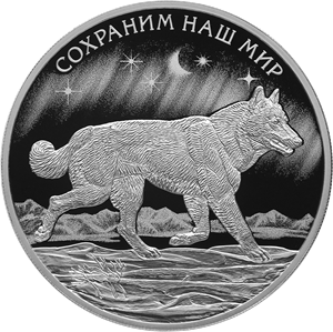 На реверсе находится изображение полярного волка на фоне скал и звездного неба. В верхней части указывается тематика - «СОХРАНИМ НАШ МИР». 4 августа 2020 года на сайте Центробанка РФ появился пресс-релиз с информацией о выпуске серебряных и золотых монет в рамках тематики «Сохраним наш мир». Всего выпустили 6 монет «Полярный волк»: 3 в серебре (3, 25 и 100 рублей) и 3 в золоте (50, 100, 10 000 рублей). 3 рубля «Полярный волк» России имеет следующие характеристики: номинал – 3 рубля; гурт – рифленый; объем чекана (тираж) – 5 000 экземпляров; качество – «пруф»; металл – серебро 925 пробы; дата выпуска – 4 августа 2020 года; тематика – «Сохраним наш мир» («Полярный волк»); масса драметалла в чистоте – 31,1 гр.; технология – лазерное матирование; диаметр – 39 мм; монетный двор – СПМД (Санкт-Петербург). Аверс 3 рублей «Полярный волк» выглядит традиционно. По центру располагается двуглавый орел, вверху по окружности находится надпись «Российская Федерация». На лицевой стороне ука