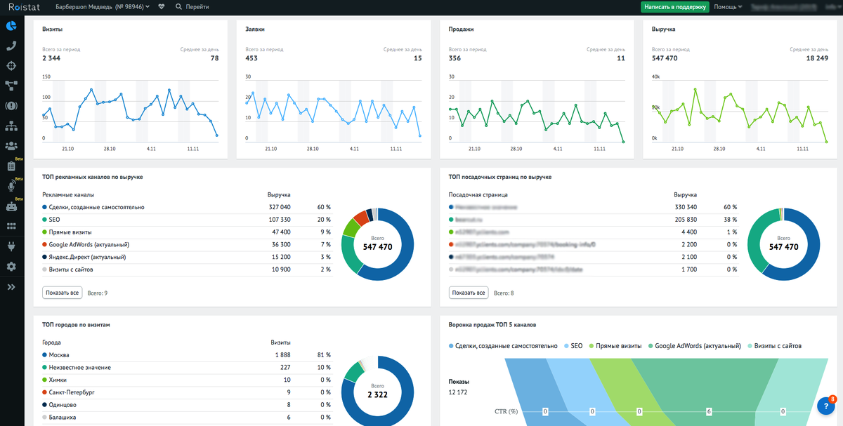 Roistat собирает данные с вашего сайта, CRM-системы и всех рекламных площадок, обрабатывает их и в считанные секунды и предоставляет отчеты по более чем 40 бизнес-показателям. Этот сервис не только собирает данные, но и самостоятельно анализирует их, позволяя частично автоматизировать ряд процессов. Например, Roistat автоматически отключает неэффективные ключевые слова в контекстной рекламе. Также здесь есть возможность управления ставками, чтобы удерживать определенные позиции, независимо от действий конкурентов.