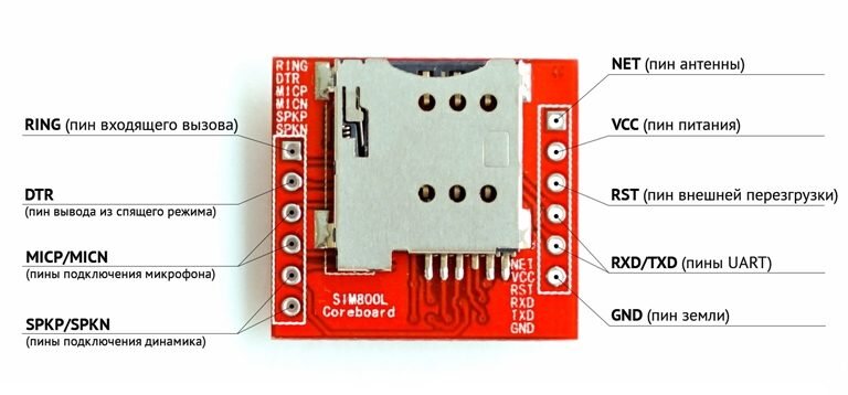 Распиновка модуля SIM800 приведена на рисунке.