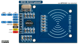 Модуль RFID RC522 выполнен на основе схемы MFRC522, которая обеспечивает беспроводную коммуникацию на частоте 13,56 МГц. Подключать микросхему можно по интерфейсу SPI, I2c и UART. Стандарт протокола NFC Reader ISO 14443.