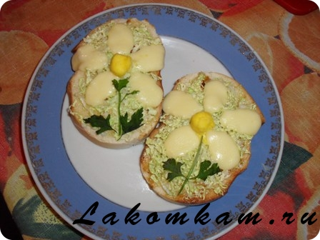 Из сыра вырезать лепестки, положить на бутерброды в виде ромашки.