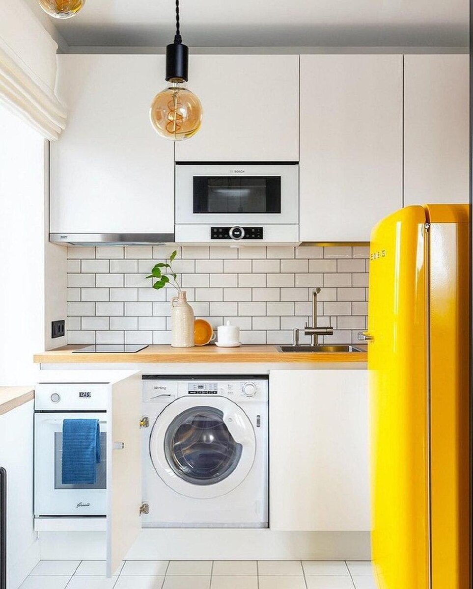 Кухня, в которой убрали стену, — самое яркое и светлое место этой чудесной квартиры. Она выглядит просто — белая мебель, белая техника. Вся, кроме ярко-жёлтого холодильника, который задаёт тон помещению.