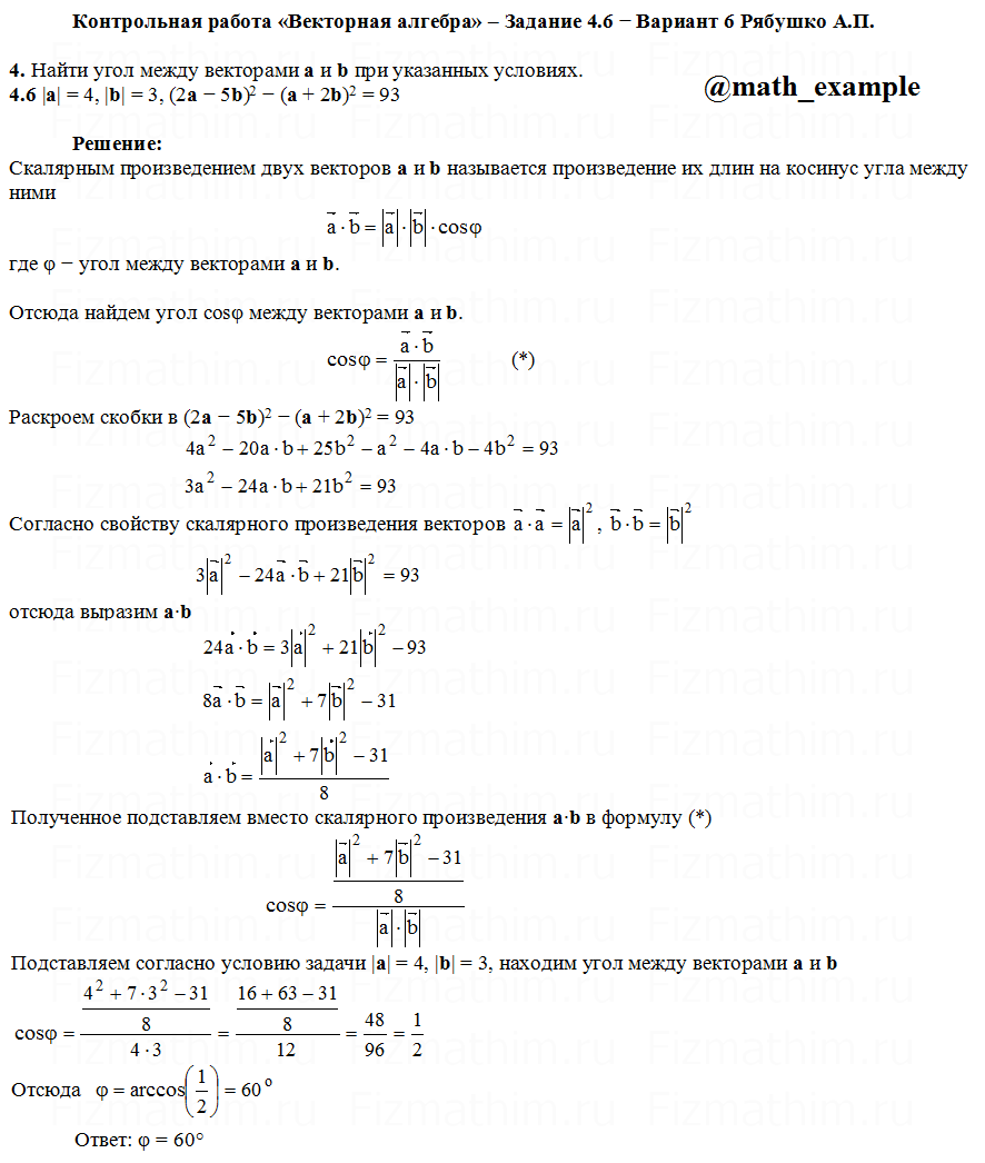 Нахождение угла между векторами a и b КР "Векторная алгебра" Задание 4.6 Рябушко А.П.