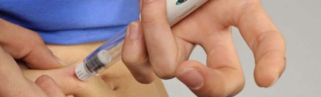 - Быстрым, но аккуратным движением введите иглу под прямым углом к поверхности кожи, если ее длины небольшая (4-5 см) или под наклоном (при большей длине иглы), чтобы ее конец дошел до подкожного жира, но не проткнул мышцу, после чего надавите на кнопку выпуска препарата до самого упора.