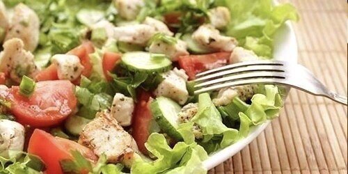 🔸 На 100 гр - 120 ккал 🔸 белки - 4,1 🔸 жиры - 1,62 🔸 углеводы - 2,1 🔸 🔹 Ингредиенты: Куриное филе — 1 шт. Помидоры — 3–4 шт. Огурцы — 1–2 шт. Листья салата Зеленый лук — 3 стебля Петрушка — 3–4 веточки Оливковое масло — 2 ст. л. Соль, перец, пряности — по вкусу 🔹 Приготовление: 1. Куриное филе и все овощи помыть. Зелень измельчить, огурцы и помидоры произвольно нарезать. 2. Разогреть сковороду с растительным маслом и обжарить курицу до золотистого цвета. Листья салата выложить на тарелку. 3. Сверху равномерно распределить нарезанные овощи. 4. Выложить на овощи остывшую курицу, посыпать измельченной зеленью. Заправить салат оливковым маслом и подавать к столу. Приятного аппетита!