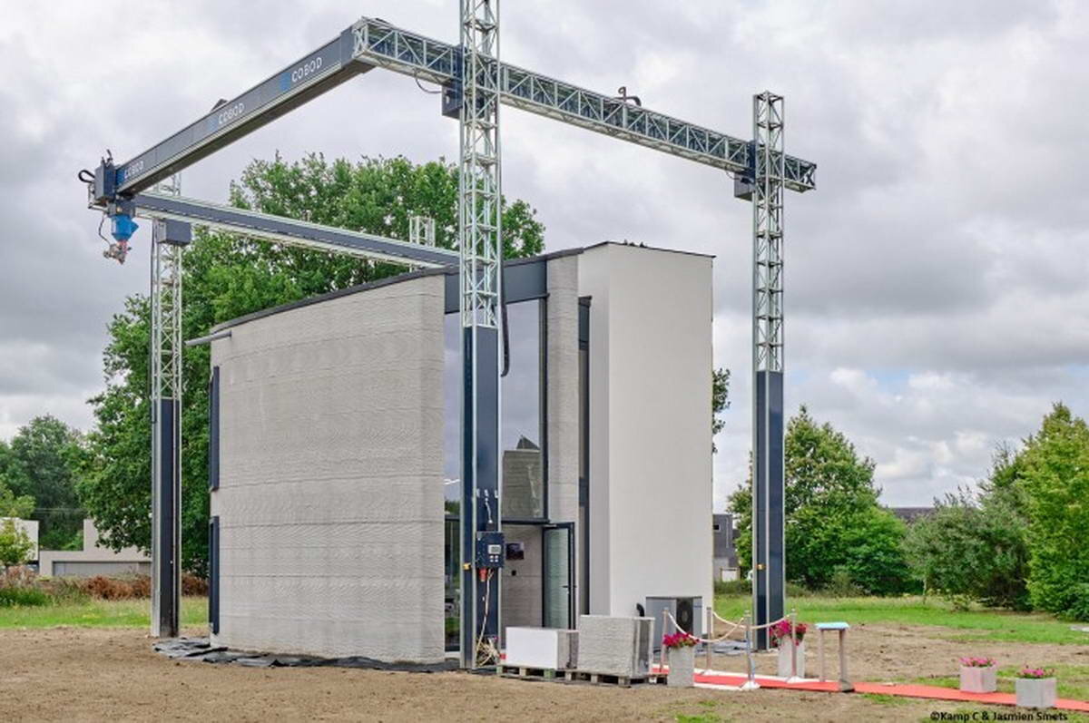 Бельгийская строительная компания Kamp C построила двухэтажный дом с помощью самого большого в Европе бетонного принтера. Это первый в мире двухэтажный дом, который будет построен в одном монолитном "куске" на месте. Печать производилась массивным цементным принтером BOD2 размером 10 x 10 метров, изготовленным компанией COBOD.