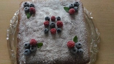 Готовый бисквит с медом можно посыпать с верху сахарной пудрой и украсить ягодами .