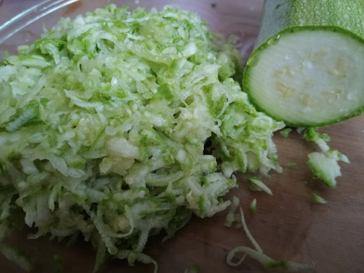 Для начала натираем кабачок на терке. В рецепте, который я видела, была мелкая терка. Попробовала - получается каша. Я так не люблю. Взяла среднюю. Но, думаю, что и крупную можно было бы