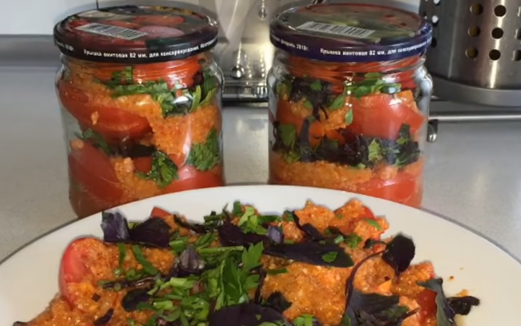 У нас получается около полбанки помидоров с приправой. Дальше мы накрываем крышечкой и кладем в тарелочку банку вверх тормашками. Предварительно встряхиваем содержимое банки, чтобы хорошо пропитались помидорки приправой.
