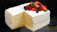 Выглядит вкусно, не правда ли? Что нам нужно для его приготовления: Продукты (на 6 порций)Для коржей:Сгущенное молоко - 300 гЯйцо - 3 шт. (общий вес со скорлупой - 195 г)Соль - 1 щепоткаМука пшеничная - 180 гРазрыхлитель - 10 гМасло сливочное - для смазывания пергамента или силиконового коврика*Для крема:Сливки 33% - 500 гСгущенное молоко - 80 гВанильный сахар - 10 г*Для украшения:Ягоды свежие - по вкусу Рецепт: Приготовить тесто. Яйца со щепоткой соли взбить миксером 3-4 минуты, до пышности. Не прекращая взбивание, постепенно добавить сгущенное молоко. Муку смешать с разрыхлителем, просеять и частями добавить в яичную смесь, перемешивая миксером. Духовку разогреть до 180 градусов. Форму для выпекания (у меня размером 30х40 см) застелить пергаментом или силиконовым ковриком и смазать небольшим количеством сливочного масла. В форму отправить половину теста (330-340 г) и распределить тонким ровным слоем. Выпекать корж при 180 градусах 6-7 минут, до готовности. Таким же образом вып