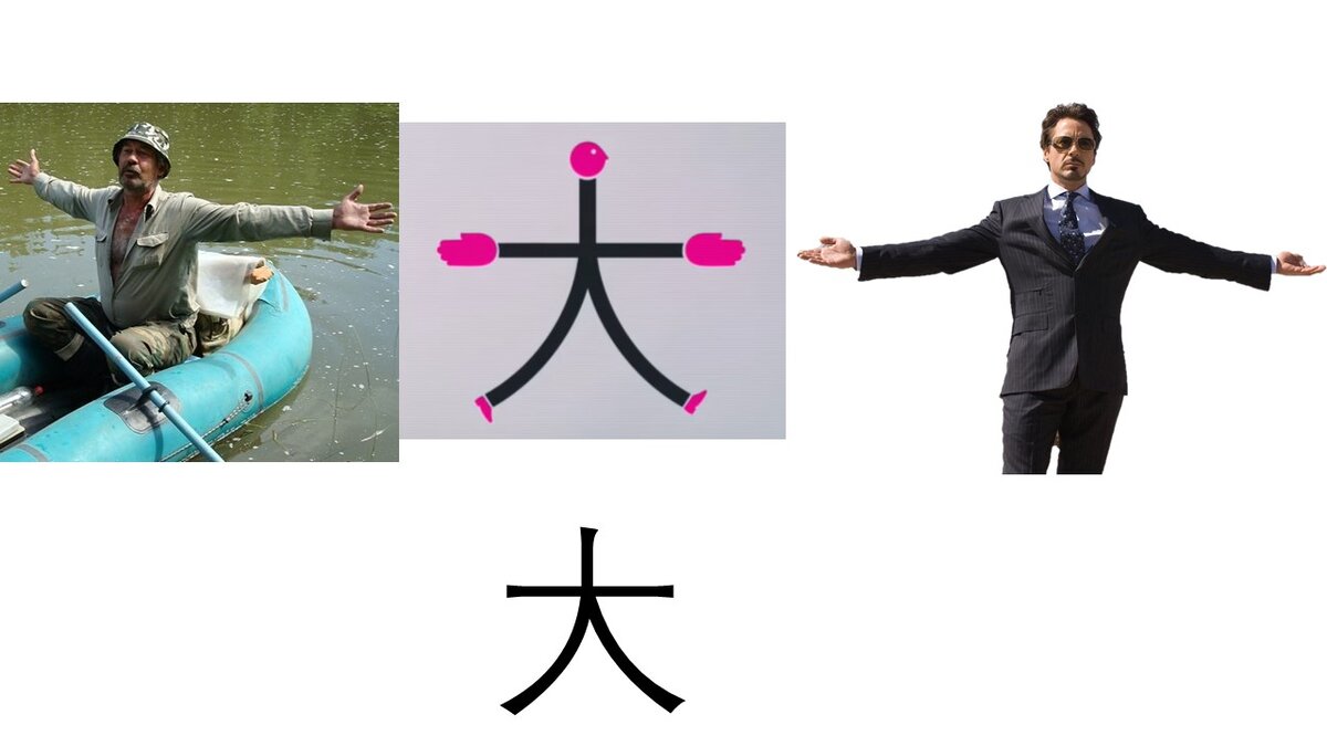 Всем, здравствуйте! Давно не виделись! Сегодня изучаем иероглиф «большой» 大. К нему можно нарисовать руки и можно представить, как рыбак поймал большууущую рыбу и показывает её размер, разводит руки. А как же произноситься этот иероглиф? Роберт Дауни младший большая фигура мирового кинематографа ? Да! (так и произноситься этот иероглиф «да» -大 большой). Оставляйте комментарии, подписывайтесь. Рад любому вашему отклику.