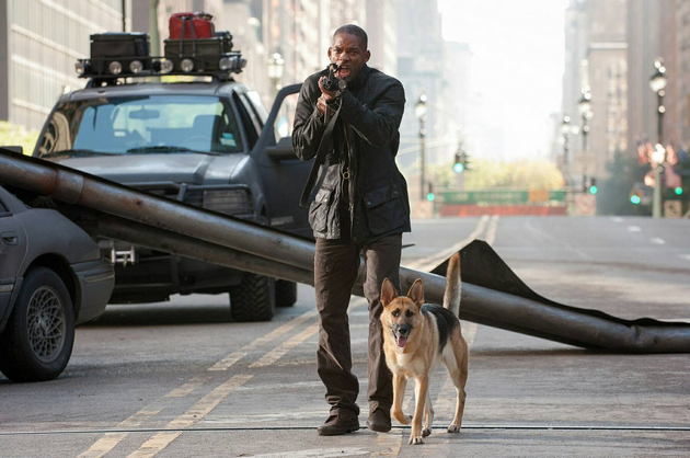 В этом фильме причиной одиночества Роберта Невилла (которого играет Уилл Смит) становятся горе-ученые. Их изобретенное лекарство от рака оказывается вирусом, запускает эпидемию и устраивает настоящий апокалипсис — убивает одну половину населения Земли, а вторую превращает в вампиров. И только главный герой сохраняет человеческий облик в силу ничем не объяснимого иммунитета. Он проводит свои дни постапокалиптическом Нью-Йорке, поросшем зеленью. Главный герой играет в гольф, пересматривает серии «Шрека» и выращивает кукурузу под песни Боба Марли.