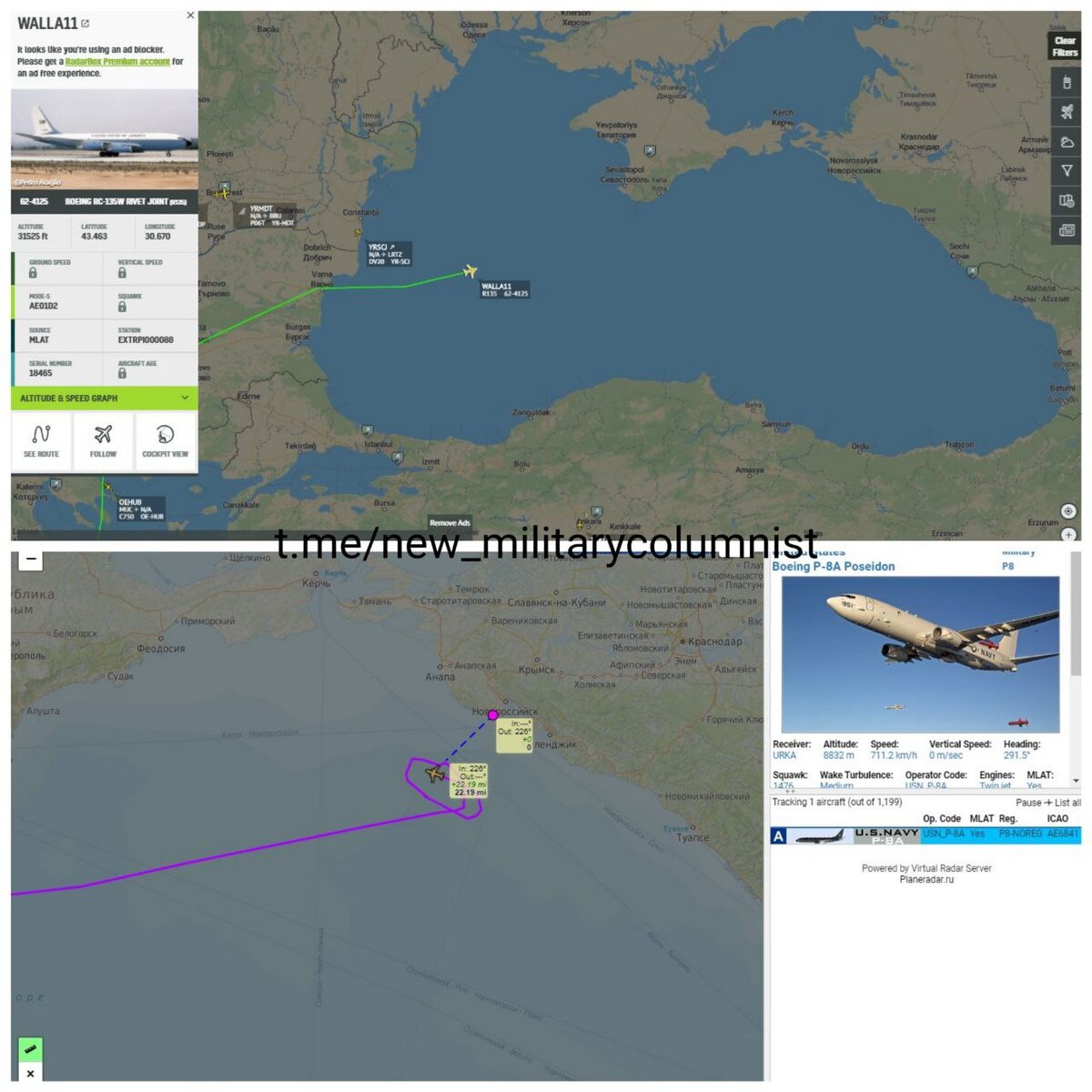 Снова работают над Чёрным морем неразлучные американские RC-135W Rivet Joint и P-8A Poseidon. Один даже оказался в 36 км от российского побережья в районе Новороссийска.