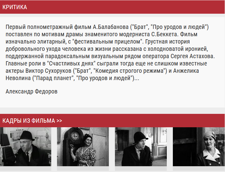 Хотя это только ИМХО, в свидетели беру Алексея Балабанова (видео в след посте). Сергей Сельянов после первого просмотра «Счастливых дней» назвал режиссера гениальным. Не возражая против гениальности, киновед Александр Федоров оставил о фильме следующий отзыв: «грустная история добровольного ухода человека из жизни рассказана с холодноватой иронией, поддержанной парадоксальным визуальным рядом». Не соглашусь ни с «добровольным уходом», ни с «холодноватой иронией», ни с «парадоксальным визуальным рядом». Как последний, так и первый фильм посвящены одной тем