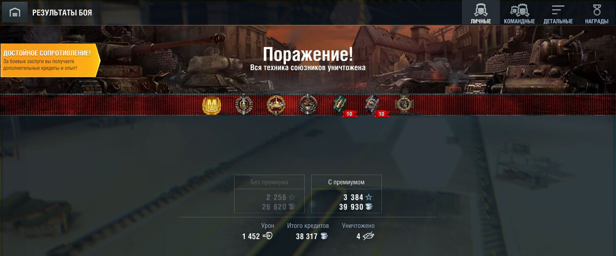 Что такое бонус за достойное сопротивление? В игре выдаётся награда за достойное сопротивление. Как это работает? Как вы могли заметить, при поражении не только ухудшается статистика — проигравшая команда получает за бой меньше опыта и кредитов. Теперь самые эффективные танкисты из проигравшей команды будут получать опыт и кредиты по тем же правилам, что и команда победителей. Для этого нужно заработать в бою одну из следующих наград: Награду за достойное сопротивление могут получить несколько игроков, а бонусный опыт учитывается при начислении знаков классности. В перечисленных категориях есть медали, которые можно получить, только победив в бою. Очевидно, что бонус за достойное сопротивление с такими наградами несовместим. Как это выглядит? Если вы сражались как 300 спартанцев в одном лице и получили одну из медалей, на экране послебоевой статистики вы увидите яркую поздравительную ленту. Так она выглядит в интерфейсе игры: Подробности о начисленном бонусе вы найдёте в детальной ст