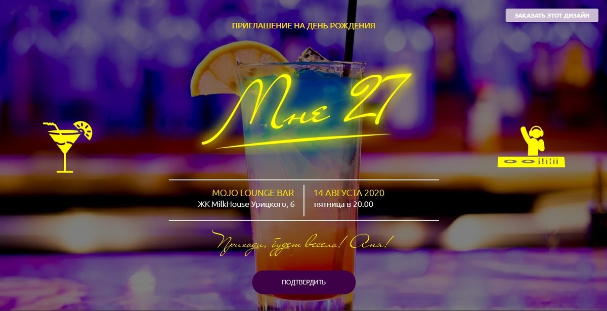 Web-invite работает на принципе двух WOW! Что это? Первое - это когда Вы получаете свой сайт-приглашение и говорите Вау, это круто! Второе - это когда Ваши друзья и близкие получают ссылку на приглашение и говорят Вау, это круто! По другому еще не было и мы этого не допустим! Сайт-приглашение на день рождения - 500 руб. И этот WOW - эффект можно достичь всего за 500 руб! А делается такое приглашение в течении часа. Как заказать? 1. Выбираете готовый макет на сайте web-invite.ru и нажимаете "Подробнее" 2. Отправьте заявку (кнопка "Заказать дизайн"),указав необходимую информацию (Имя именинника, дата и место празднования и т.д.) 3. В течении часа Вам придет ссылка с Вашим готовым приглашением. Если все нравится, оплачиваете и отправляете его своим друзьям! 4. Получаете восторженные комментарии друзей и подтверждение их присутствия на дне рождения на Ваш e-mail или в Telegram. Шаблоны Light стоят всего 500 рублей. Это самое простое приглашение (только не в дизайне), в котором указано са