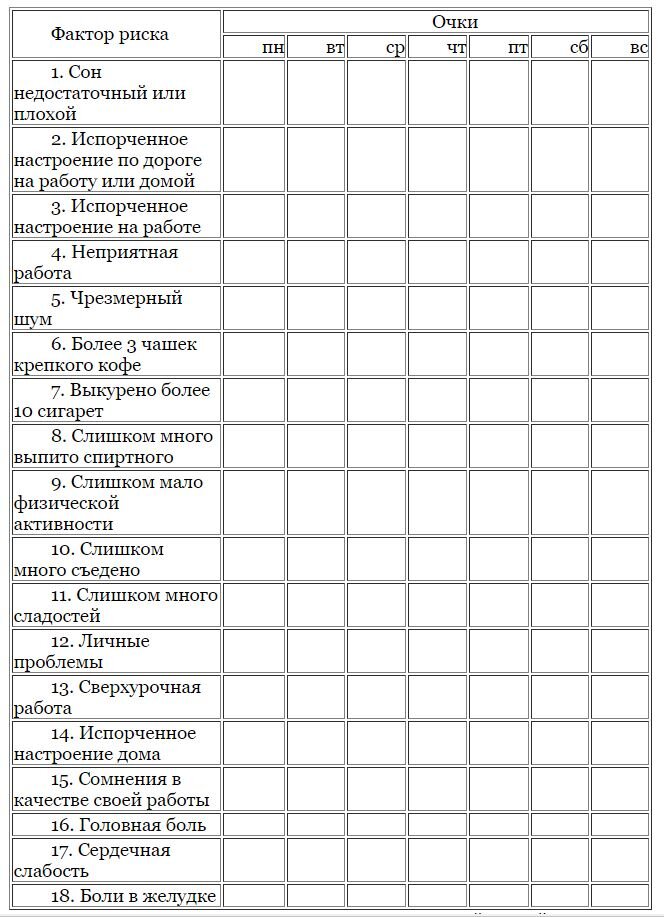 Данный тест предполагает, что вы в течение недели по вечерам заполняете нижеприведенную таблицу. Это поможет вам определить уровень собственного стресса. Необходимо поставить галочку против тех пунктов, где приходится давать утвердительный ответ. Каждая «галочка» дает одно очко. В конце недели итоги суммируются. 1—20 очков. Положение нормальное. На всякий случай проверьте себя в течение еще одной недели, так как ваше субъективное восприятие «слишком много» или «слишком мало» может оказаться несамокритичным . 21—40 очков. Пока ситуация не слишком тревожная, но уже необходимо обратить внимание на пункты, давшие очки. В скором времени они могут перерасти в серьезную угрозу. 41—60 очков. Угроза налицо. Если в самое ближайшее время вы не предпримете решительных шагов к изменению своего образа жизни, то вас ожидают, к сожалению, крупные неприятности. Свыше 60 очков. Ваше здоровье в серьезнейшей опасности. Необходимо пункт за пунктом проанализировать заполненную вами таблицу и постараться н
