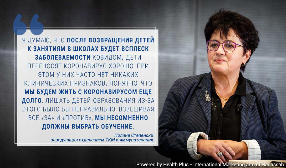 Скоро первое сентября, во многих странах готовятся к открытию школ. Не секрет, что у большинства родителей данное событие вызывает вполне оправданные опасения. Особенно у тех, кто живет или тесно общается с пожилыми людьми, входящими в основную группу риска. Что же делать? Стоит ли отпускать детей в школу и как наиболее эффективно защитить от коронавируса и самого ребенка, и остальную семью? Как и многие другие эксперты, Полина Степенски считает, что, несмотря на пандемию, нет повода лишать детей школьного образования. Читайте на официальном сайте клиники “Хадасса” интервью с профессором Степенски, в котором она поделилась своими мыслями по поводу предстоящего учебного года и коронавируса. Остались вопросы или нужна консультация? Напишите в личные сообщения сообществу или в комментарии под публикацией. Будем рады помочь! #hadassah #хадасса #израильскаямедицина #коронавирус #covid