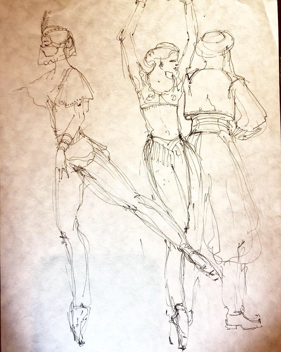 Домашние задания делать было некогда, работала, и поэтому сидела в кулисах рисовала. Рисовала всегда, у меня был кусок доски, ручки, фломастеры и я учила «руками» анатомию, историю костюма, движение. Часть эскизов со мной, часть нужно посмотреть у родителей. Смотрю сейчас на них, столько ошибок вижу. Сейчас бы перерисовала, одно оправдывает, никто не позировал - поймала - молодец!