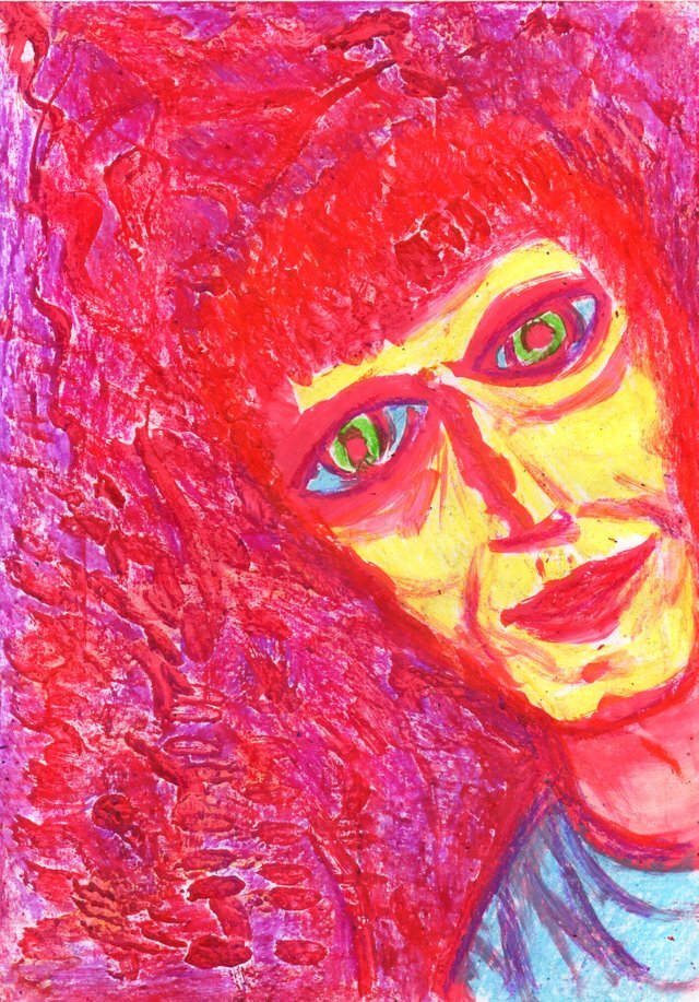 At first he sketched the drawing with gouache, and then painted it with wax pencils. The figure shows a person with fiery emotions that can set fire to everything.